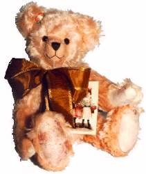The Poesy Bear is made of English peach mohair and stuffed with excelsior. The size is 14 1/2 inch. It has a original poesy-picture arround the neck.