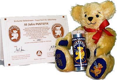 In 1948 the chemist, Dr. Rolf Hein, found a solution which is perfectly suitable to blow great soap bubbles. He had the idea to create a toy, that makes it easy to blow beautiful bubbles. Searching for the right trademark, he found his children's little yellow bear. As a dad, he knew that no other symbol characterizes a toy better than a teddy bear. As a result of this, the PUSTEFIX trademark was designed with the help of this teddy bear. In conjunction with the Dr. Rolf Hein KG, who is celebrating their 50th anniversary of the PUSTEFIX this year, HERMANN-Coburg presents a replica of the PUSTEFIX bear from the old PUSTEFIX logo of 1948. Old significant trademark replica's are always very popular among collectors. Looking for a retailer in your area ? - Please check our Database for the USA |