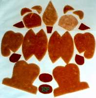 Step 1: The cuttingThe classic HERMANN-Coburg Teddy Bear with a nose made of a short pile mohair has 10 different patterns with all together 20 parts, which all have to be cut. On the paw there is already marked the Teddy Bear's own individual limit number. |