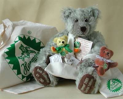 Sammler Sonderedition Hennef 2001 Bear Collector - Teddybär Sammler mit zwei HERMANN-Coburg Miniatur-Bären, gefertigt aus unterschiedlichen, alten Materialien, made in Germany, by HERMANN in Coburg, verpackt in den beiden Teddybären-Sammler-Einkaufstaschen.Jeder Miniatur-Bär ist im Rahmen der Gesamtlimitierung auf 4 Stück limitiert. mit zwei Miniatur-Replica-Katalogen alter Max Hermann Kataloge aus den 20er und 40er Jahren. Limitierung 80 Stück |