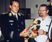 Baron Freunde Der Rote Baron - Red Baron Bear wurde zu Ehren von Freiherr von Richthofen an das Jagdgeschwader 71 Richthofen in Wittmund für deren Richthofen-Museum übergeben. Die feierliche Überreichung wurde von Herrn Oberstleutnant Günther Hotz (rechts) vorgenommen. |