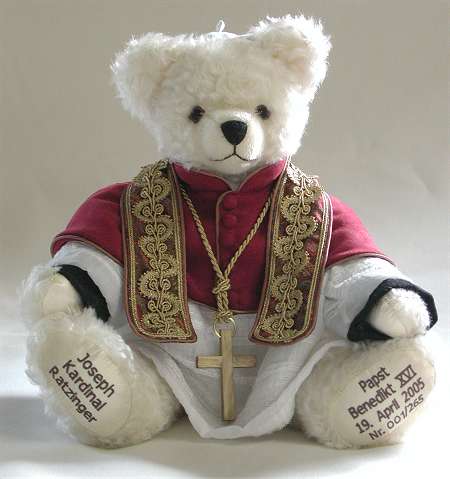 Für die mehrfach international ausgezeichnete Teddybärenkünstlerin Ulla Hermann aus dem Hause HERMANN-Spielwaren stand mit der Wahl von Joseph Kardinal Ratzinger zum neuen Papst fest, dass es eine sehr exklusiv limitierte Sonderedition eines Teddybären geben muss. Die Edition von nur 265 Stück (Anzahl der bisherigen Päpste), die erstmals am Samstag bei Teddybär Total der Öffentlichkeit vorgestellt wird, wird ein Highlight der 2005er Messe sein.