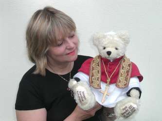 "Wir sind stolz, dass nach fast 480 Jahren wieder ein Deutscher dieses höchste Kirchenamt inne hat. Der Teddybär ist die Art meine Gefühle zum Ausdruck zu bringen." meint die promovierte Künstlerin.