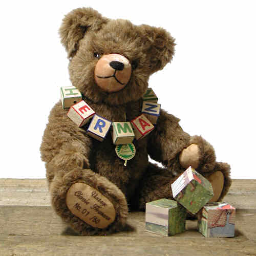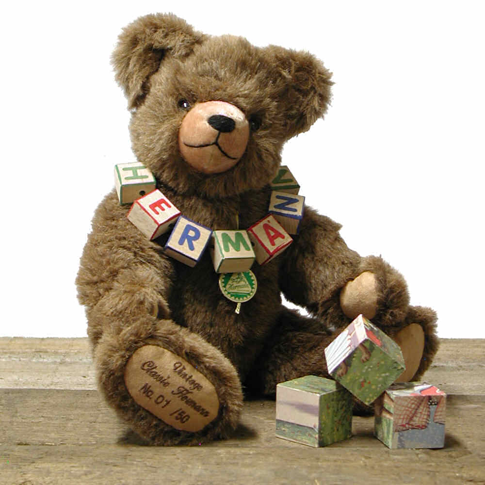 | 11976-8 Vintage Classic Hermann, dunkel-braun mit HERMANN Holzbausteinen-Kette Web-Plüsch aus den 1950th feste Wattefüllung 36 cm = 14 1/4 inch Limitierung 50 Stück |