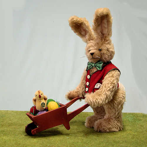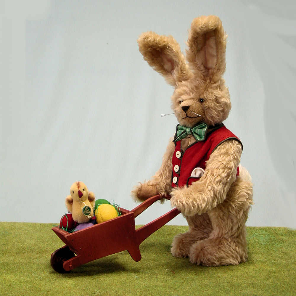 | 20214-9 Mohairplüsch, Holzwollfüllung mit Holz-Schubkarre mit Miniatur Kücken und Filz-Eiern 37 cm = 14 1/2 inch Limitierung 50 Stück |
