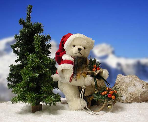 | 22382-3 Little White Santa auf Schlitten Mohairplüsch, feste Wattefüllung 32 cm = 12 1/4 inch Limitierung 100 Stück |